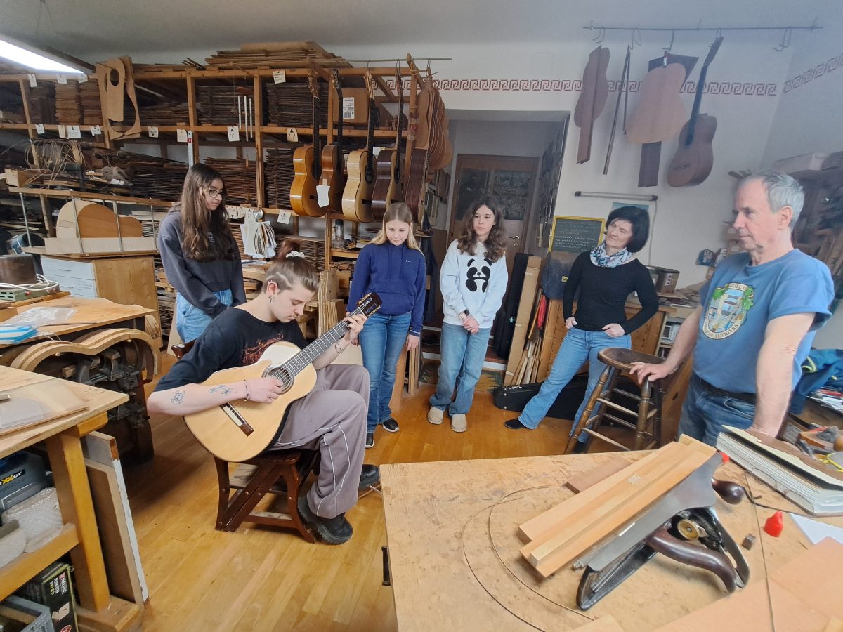 Schülerinnen und Schüler unserer Musikschule besuchten mit den Gitarrelehrerinnen Ksenija Rothwangl und Regina Griesenhofer-Barszczewski an einem Samstagvormittag den Gitarrenbauer Tobias Braun in Gaaden im Wienerwald.